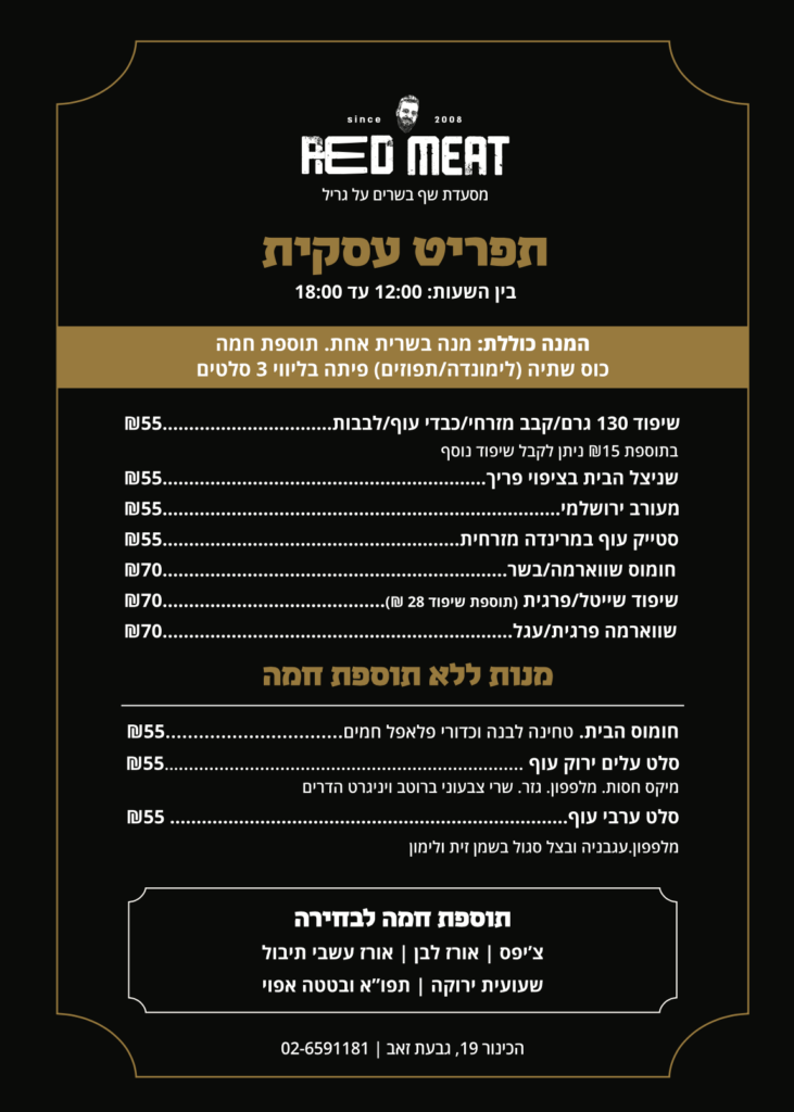בימי חול בין השעות 12:00-18:00 ניתן ליהנות מתפריט עסקיות מגוון, ולאחר מכן עד השעה 23:00 מוגש תפריט המסעדה המלא.